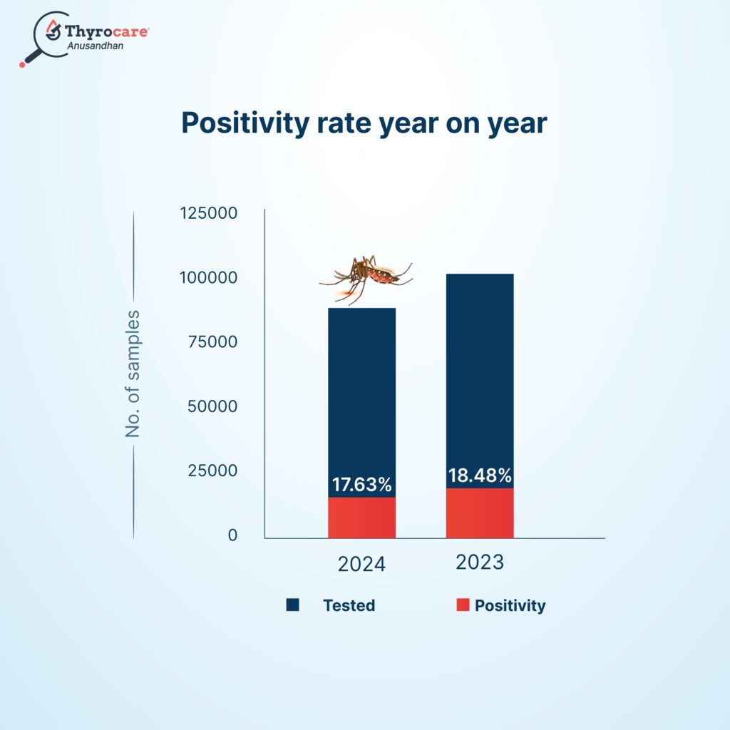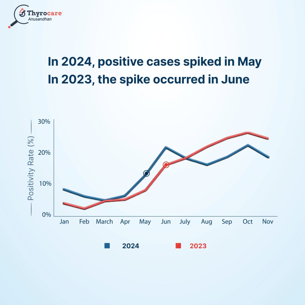 The positivity rate amongst 87,156 patients tested PAN India in 2024 was 17.63% which was similar to the previous year’s positivity rate of 18.48% out of 1,00,800 patients tested. Dr. Hardeep Vora (PhD. – Immunology) highlighted that “The spike in the positivity rate started in the month of May in 2024 compared to June in 2023, indicating an early onset of this disease in 2024”.