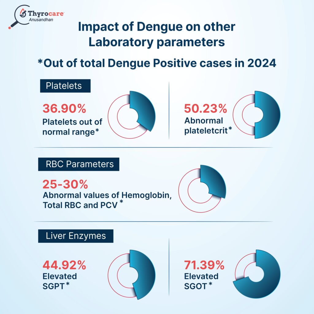 In 2024, among the dengue- positive cases, platelets were found to be out of the normal range in 36.90% of patients, substantially lower than 44.19% in 2023 while plateletcrit levels were abnormal in over half the positive cases affecting 50.23% patients. Other blood parameters such as Hemoglobin, total number of RBCs, packed cell volume (PCV) etc. were outside normal ranges in 25-30% of the dengue-positive patients. Moreover, elevated liver enzymes such as SGPT and SGOT levels were abnormal in 44.92% and 71.39% of dengue-positive patients respectively.